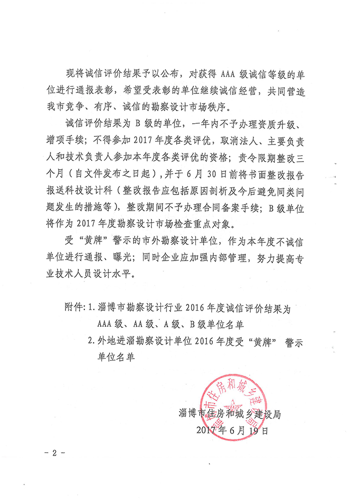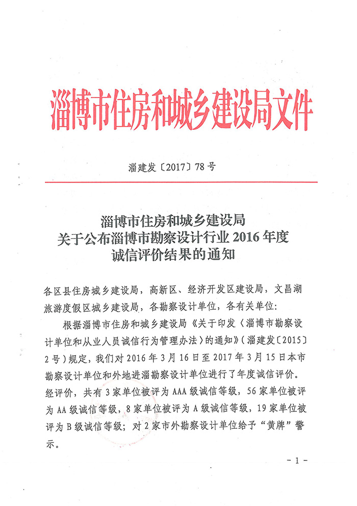 贺我公司荣获淄博市勘察设计行业2016年度诚信评价AAA级诚信单位
